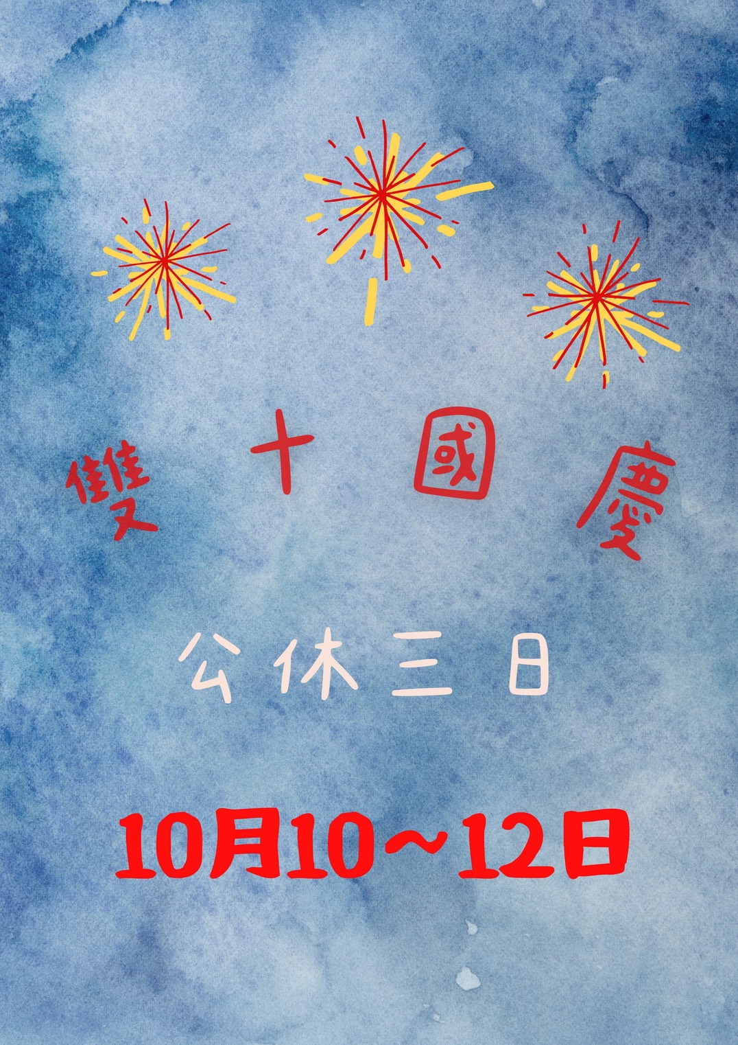 雙十節 10/10~10/12 公休三日,10/13 正常營業