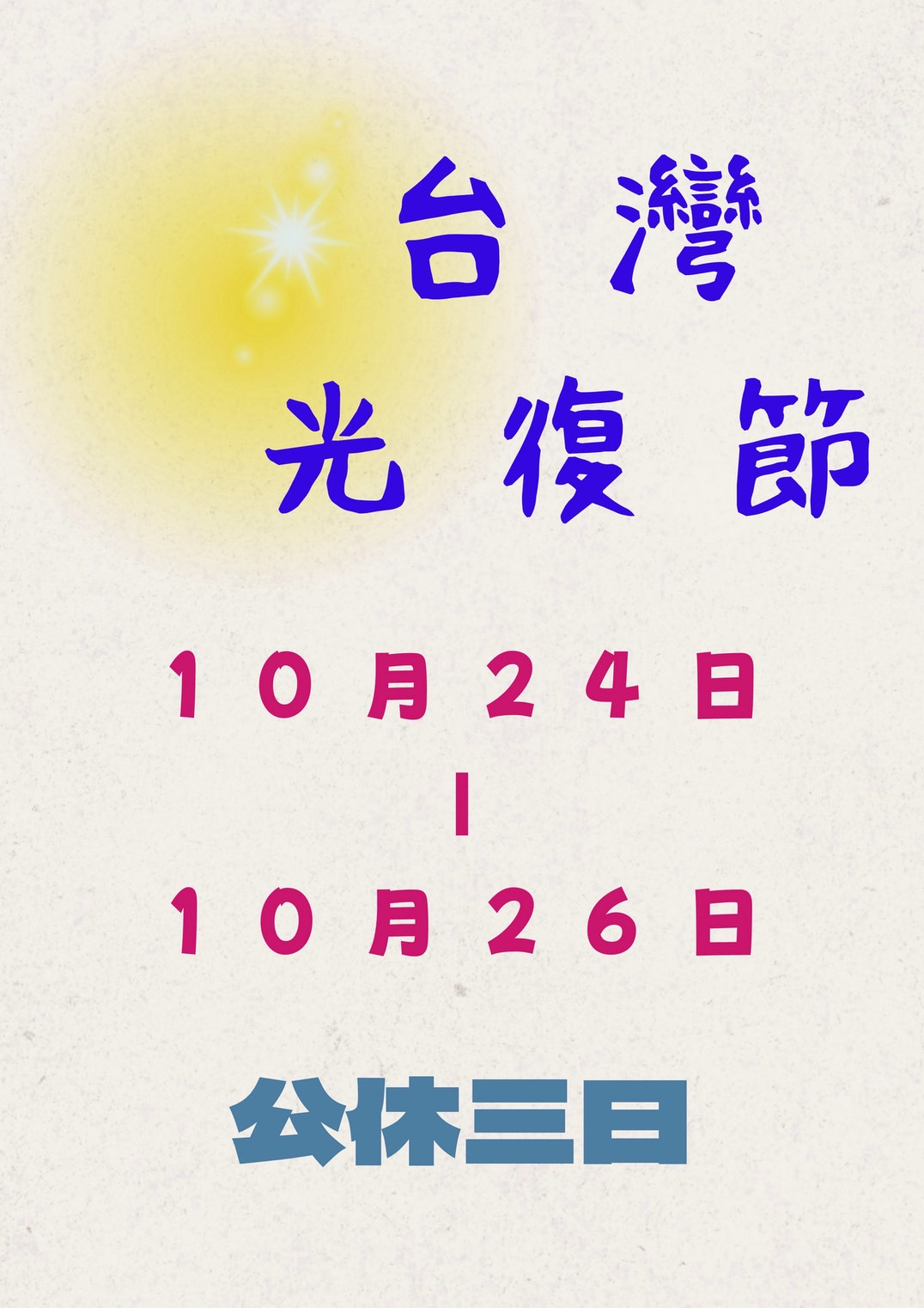 光復節10/24~10/26公休三日,10/27正常營業